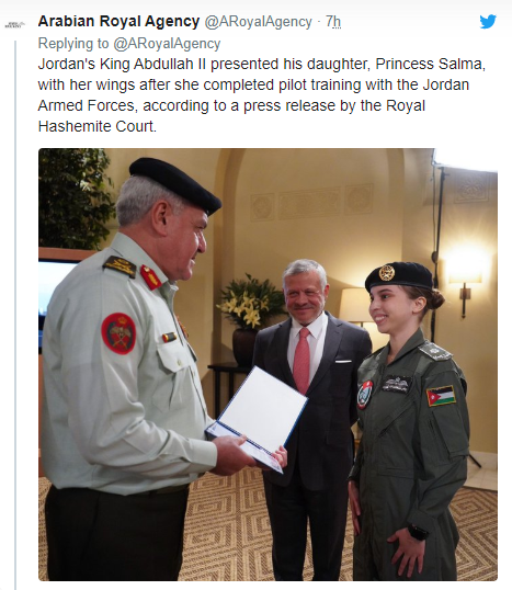 19-летняя девушка закончила обучение пилотов на самолетах. На церемонии вручения соответствующей награды присутствовали королева Рания и ее старший брат, принц Хуссейн. Брат девушки является первым лейтенантом в Вооруженных силах. В Instagram он поздравил сестру с успешным завершением обучения. "Блестящая и трудолюбивая, как всегда! Поздравляю с получением своих крыльев. Еще больше успехов и достижений", – написал он.