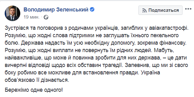 "Понимаю, что никакие слова поддержки не заглушат их (родственников - Ред.) адской боли. Государство предоставит им всю необходимую помощь, в том числе финансовую. Понимаю, что никакие выплаты не вернут им родных людей. Пожалуй, самое важное, что может и должна сделать для них государство, - это дать исчерпывающие ответы относительно всех обстоятельств трагедии", - написано в соцсети Зеленского.
