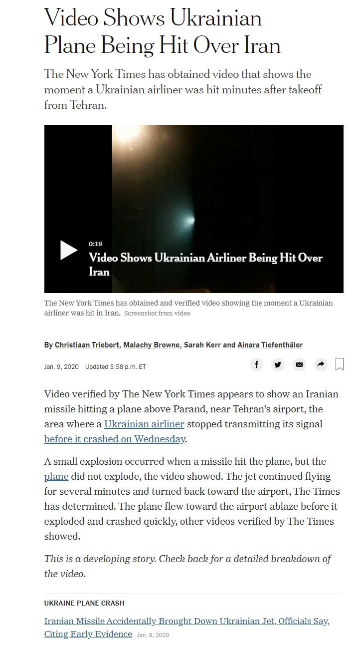 Как сообщала "Страна", ранее группа Bellingcat подтвердила, что видео ракетного удара, о котором пишет газета, снято в городе Паранде, где упал самолет МАУ.