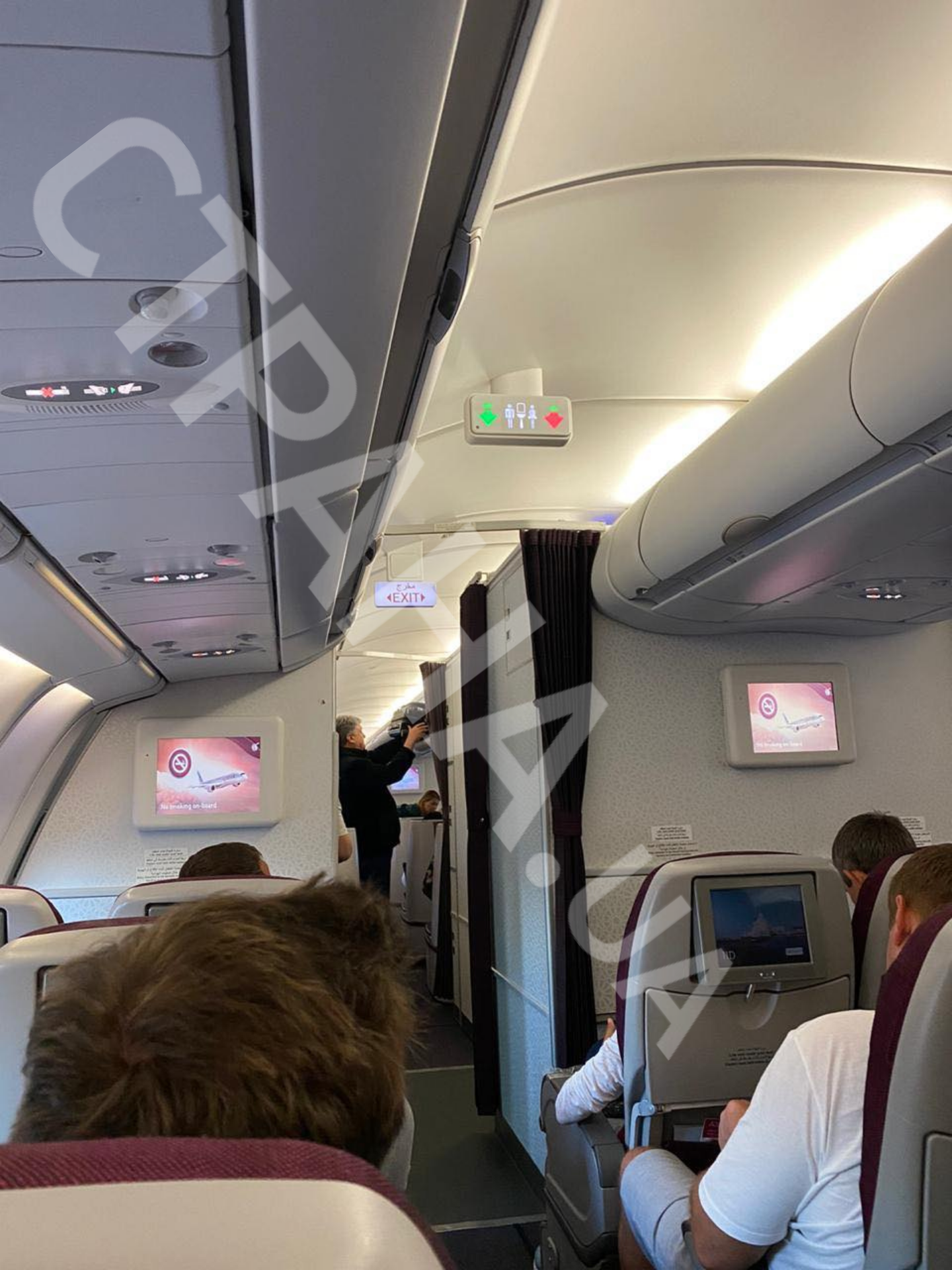 В распоряжении "Страны" оказалось фото экс-президента. На снимке видно, как он забирает свой багаж с полки в бизнес-классе перед тем, как выйти из самолета в аэропорту "Борисполь".