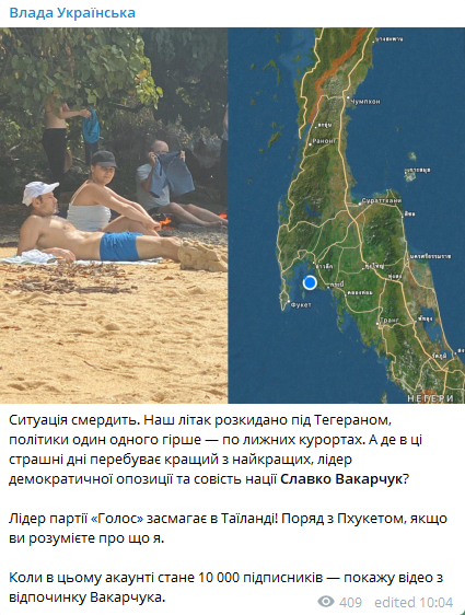 Фото опубликовал телеграм-канал "Влада Українська". "Ситуация воняет. Наш самолет разбросан под Тегераном, политики друг друга хуже - по лыжным курортам. А где в эти страшные дни находится лучший из лучших, лидер демократической оппозиции и совесть нации Славко Вакарчук? Лидер партии "Голос" загорает в Таиланде! Рядом с Пхукетом, если вы понимаете о чем я", - говорилось в сообщении.