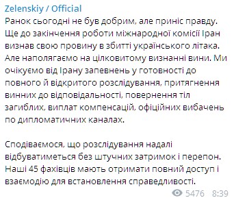 "Утро сегодня не было добрым, но оно принесло правду. Еще до окончания работы международной комиссии, Иран признал свою вину, что сбил украинский самолет. Но мы настаиваем на полном признании вины. Мы ожидаем от Ирана заверений в готовности к полному и открытому расследованию, привлечению виновных к ответственности, возвращению тел погибших, выплат компенсаций, официальных извинений по дипломатическим каналам", - говорится в обращении.