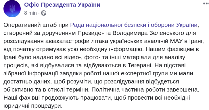 В Офисе президента Украины заявили о том, что оперативный штаб при Совете национальной безопасности и обороны Украины, созданный по поручению президента Владимира Зеленского для расследования авиакатастрофы самолета украинских авиалиний МАУ в Иране, с самого начала получал всю необходимую информацию. Об этом говорится на Facebook-странице Офиса президента.