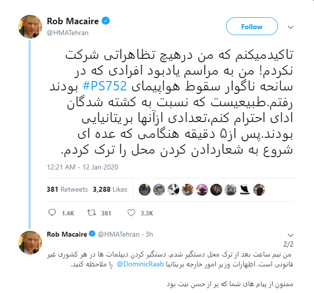 Посол Британии в Тегеране Роберт Макэйр отрицает, что принимал участие в протестах на территории Ирана. Об этом он написал в своем Тwitter.