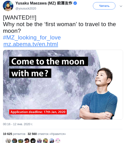 Японский 44-летний миллиардер Юсаку Маэдзава объявил конкурс для девушек, которые готовы стать его женой и полететь с ним на Луну. Его проект называется "сватовство для серьезных отношений один на один". Об этом он написал в Twitter.