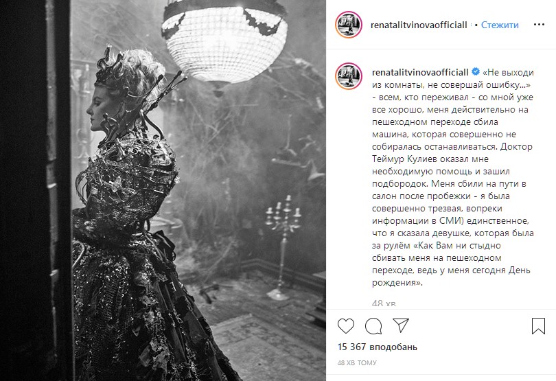 "Всем, кто переживал - со мной уже все хорошо, меня действительно на пешеходном переходе сбила машина, которая совершенно не собиралась останавливаться. Доктор Теймур Кулиев оказал мне необходимую помощь и зашил подбородок. Меня сбили на пути в салон после пробежки - я была совершенно трезвая, вопреки информации в СМИ) единственное, что я сказала девушке, которая была за рулем. Как Вам ни стыдно сбивать меня на пешеходном переходе, ведь у меня сегодня День рождения", - утверждает она.