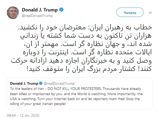 Напомним, американский президент Дональд Трамп выразил поддержку протестам в Иране, которые охватили страну после того, как правительство признало, что самолет авиакомпании МАУ был сбит иранскими военными. Сделал он это на языке фарси.