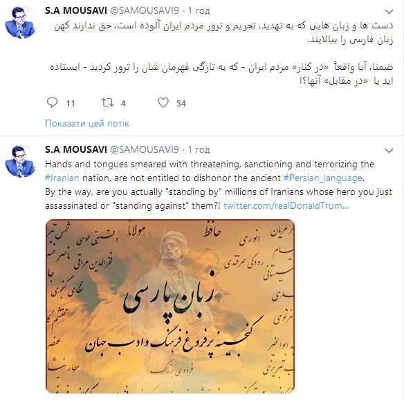 "Руки и языки, испачканные угрозами, санкциями и террором иранской нации, не имеют права позорить древний персидский язык", - говорится в сообщении.