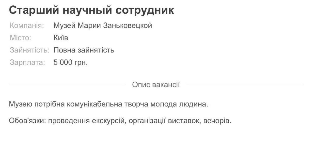 Старшему научному сотруднику в музее Марии Заньковецкой предлагают 5 тысяч гривен.