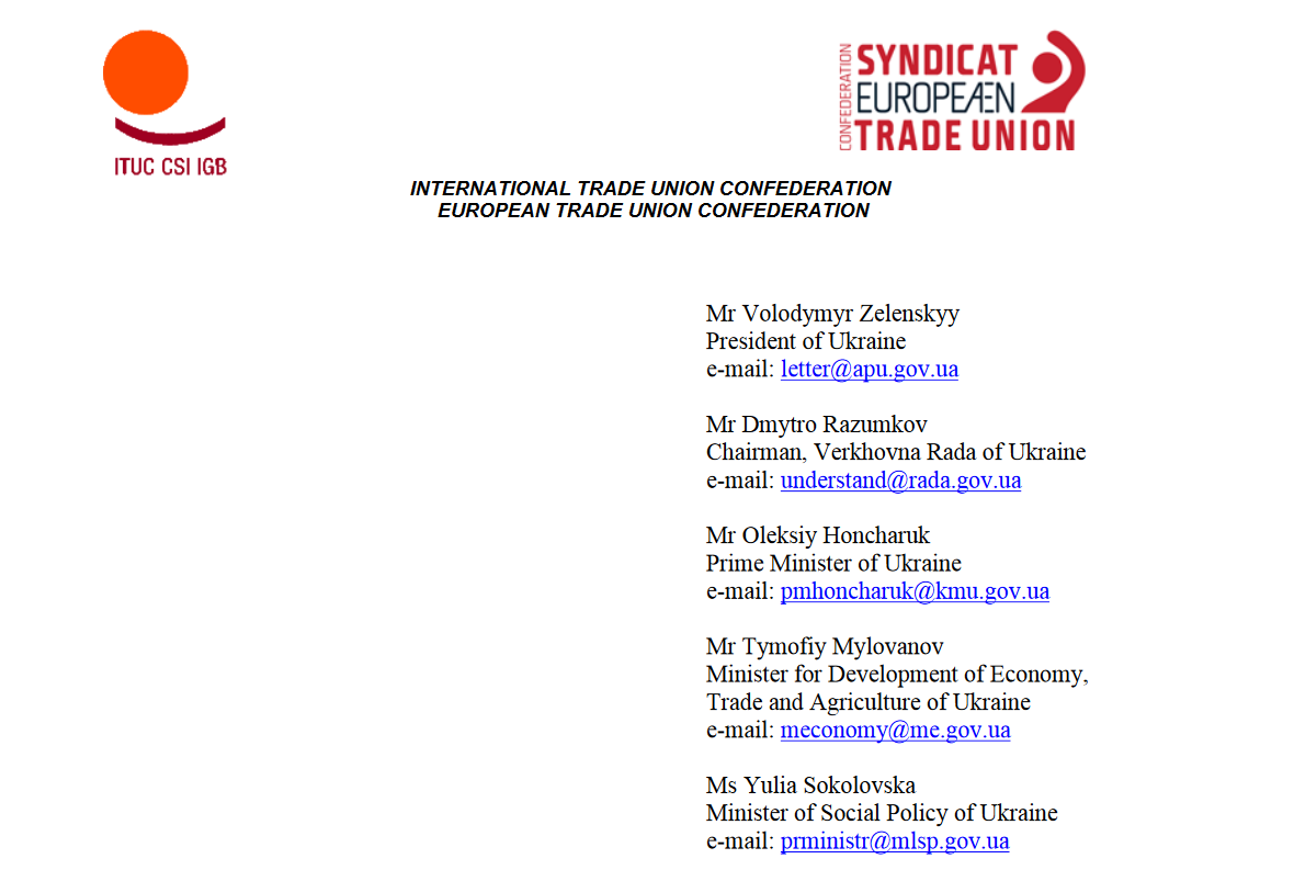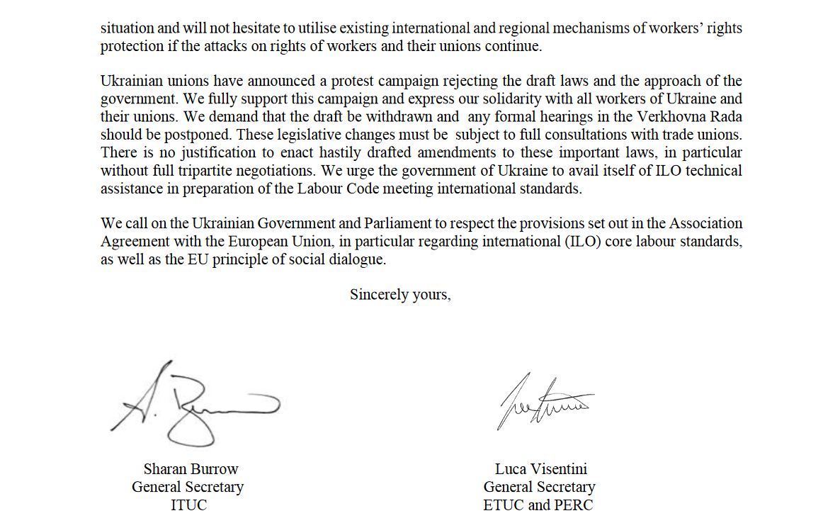 "Украинские профсоюзы объявили о проведении кампании против законопроектов и политики правительства. Мы полностью поддерживаем эту кампанию и выражаем солидарность со всеми работниками Украины и их профсоюзами. Мы требуем отозвать законопроект и отложить любые официальные слушания в Верховной Раде. Эти законодательные изменения должны быть предметом полномасштабных консультаций с профсоюзами. Нет ни одного обоснования поспешному принятию разработанных законопроектов, в частности без полноценных трехсторонних переговоров. Мы призываем правительство Украины воспользоваться технической помощью МОТ в подготовке трудового кодекса, который отвечал бы международным стандартам.