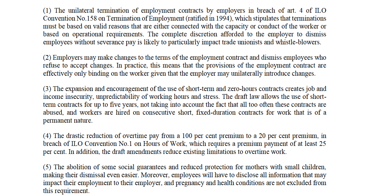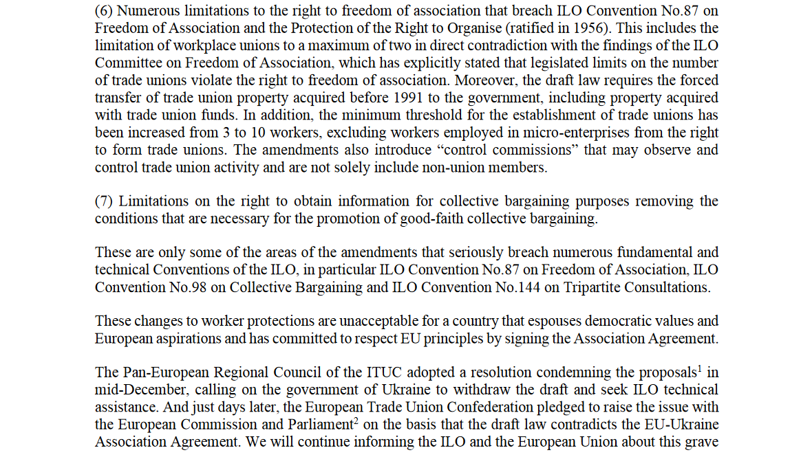 "Это лишь некоторые из тех положений законопроектов, которые серьезно нарушают многочисленные основополагающие и технические конвенции МОТ, в частности Конвенцию МОТ №87 о свободе объединений, Конвенцию МОТ №98 о коллективных переговорах и Конвенцию МОТ №144 о трехсторонних консультациях. Такие изменения в защите работников неприемлемы для страны, которая заявляет о своей верности демократическим ценностям, декларирует европейские стремления и обязалась придерживаться принципов ЕС, подписав Соглашение об ассоциации", - считают авторы письма.