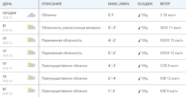 Ресурс Weather.com сообщает о переменной облачности на протяжении всей недели, но без осадков. Температура днем +4...+5, на выходных чуть холоднее +1...+2. Ночная температура от -2...-4.