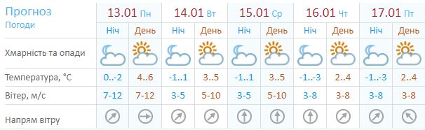 По данным Gismeteo, с понедельника по пятницу включительно в Киеве днем +3...+5. Ночью +1...-2. На выходных, 18-19 января, днем -1...-2, ночью до -3. Во вторник, 14 января, и в четверг, 16 января, возможен дождь.