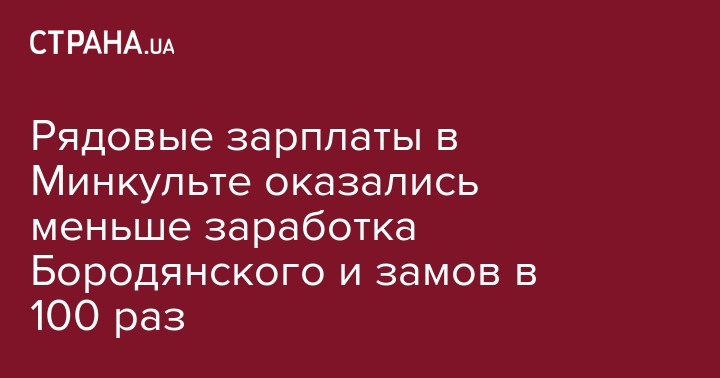 Зарплаты рядовых работников в Минкульте меньше зарплат министра культуры Владимира Бородянского и замов в 100 раз. Так, и в Киеве, и в регионах заработные платы работников музеев, кассиров, библиотекарей составляют 3500-5000 грн. Об этом свидетельствуют сайты вакансий.