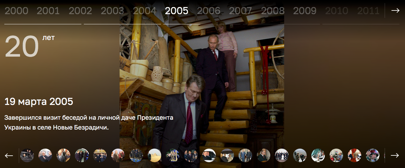 Первая порция кадров - с 2000 по 2005 год - появилась накануне Нового года. В этот период времени у президента России было много встреч с тогдашним украинским лидером Леонидом Кучмой. Вместе они несколько раз посещали Крым, гуляли там и пили вино, праздновали общие дни рождения, посещали рыбалку.