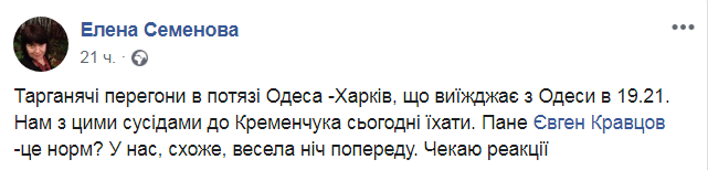 "Тараканьи бега в поезде Одесса - Харьков, который выезжает в 19:21. Нам с этими соседями до Кременчуга сегодня ехать. Господин Евгений Кравцов (глава правления "Укрзализныци" – Ред.) - это норм? У нас, похоже, веселая ночь впереди. Жду реакции", - написала Елена.