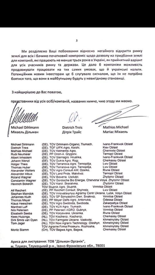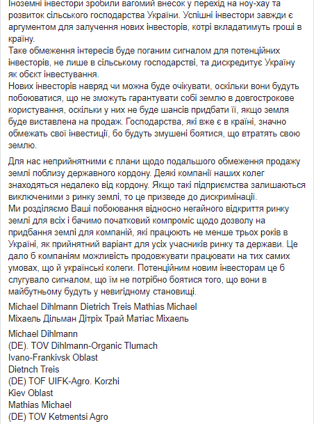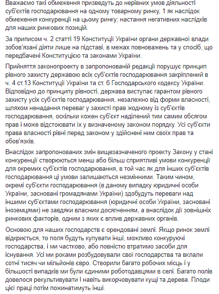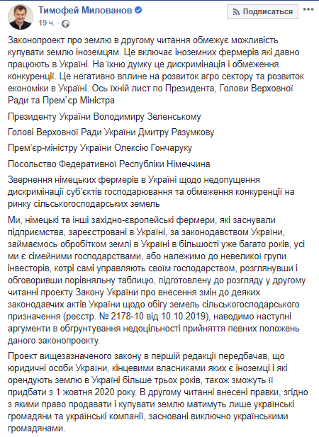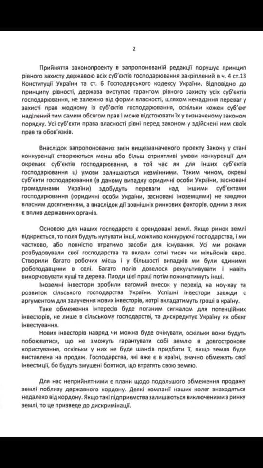 Письмо опубликовано на странице министра экономики Тимофея Милованова в Facebook. Авторы обращения отметили, что норма, которая предложена в законопроекте о рынке земли, и которая запрещает иностранцам или иностранным компаниям покупать землю сельхозназначения, противоречит Конституции Украины.