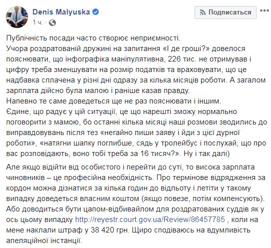 Денис Малюська считает, что высокая зарплата чиновников - это профессиональная необходимость. "О срочной командировке за границу можно узнать за несколько часов до отлета и лететь в таком случае придется за свой счет (если повезет, потом компенсируют). Или приходится быть козлом отпущения для раздраженных судей, когда на меня наложили штраф в 38 420 грн. Искренне надеюсь на вдумчивость апелляционной инстанции", - написал он.