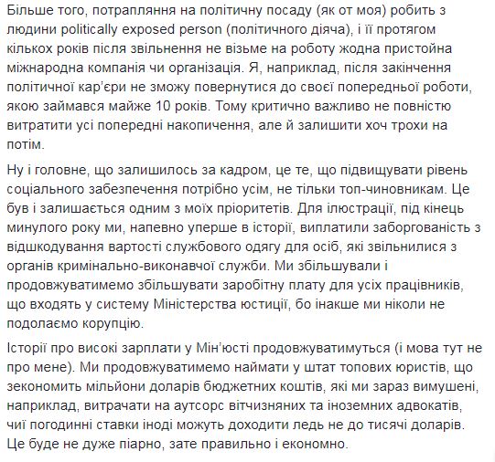 Глава министерства юстиции Денис Малюська, который в декабре 2019 года получил премии за 3 месяца на общую сумму 190 400 гривен и зарплату за декабрь в 226 000 гривен, заявил, что высокая зарплата ему нужна для создания запаса, так как "в течение нескольких лет после увольнения его не возьмет на работу ни одна приличная международная компания". Об этом он сообщил в Facebook.