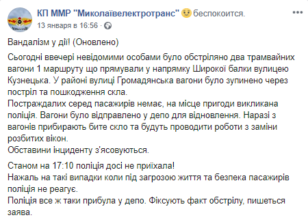 Вечером 13 января в Николаеве трамвай с пассажирами был обстрелян неизвестными. В результате происшествия никто не пострадал. Об этом сообщает пресс-служба КП "Николаевэлектротранс" в Facebook.