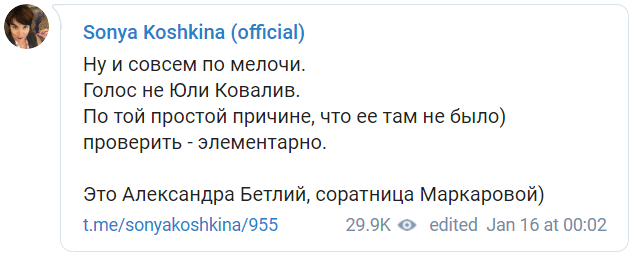 Скриншот: Telegram/ Sonya Koshkina (official)