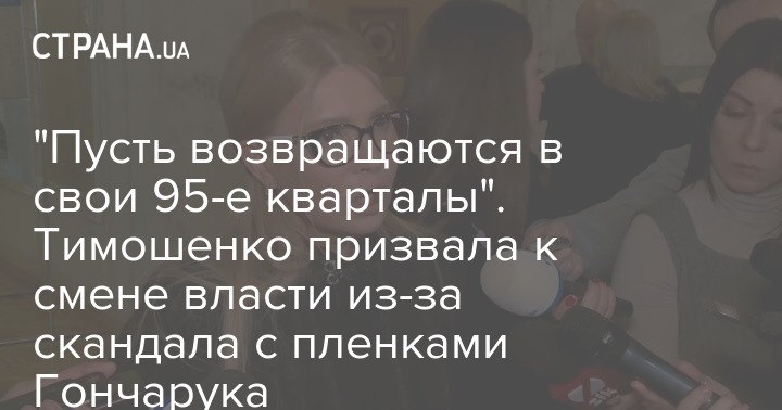 Глава фракции "Всеукраинское объединение "Батькивщина" в Верховной Раде Украина Юлия Тимошенко выступила с критикой деятельности президента Зеленского и партии "Слуга народа", заявив, что "их всех надо немедленно убирать". Так Тимошенко прокомментировала скандал вокруг утечки записей разговора премьер-министра Украины Алексея Гончарука с финансовым блоком правительства и НБУ.
