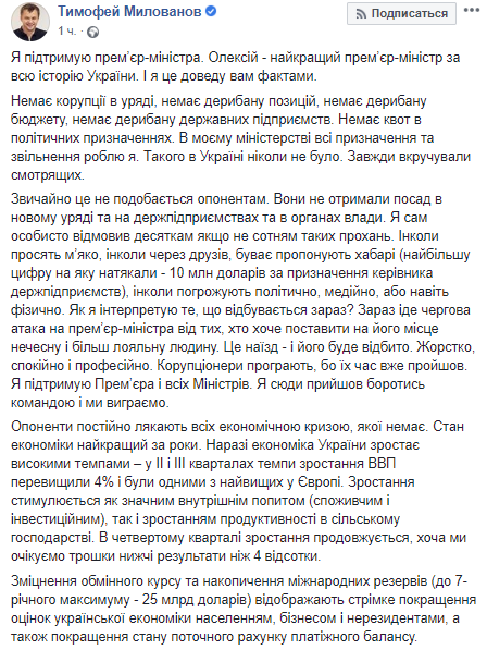 Глава министерства экономики Тимофей Милованов поддержал премьер-министра Украины Алексея Гончарука, который попал в скандал после публикации в сети записей якобы его разговора, и заявил, что считает его лучшим премьером за всю историю Украины. Об этом он сообщил на своей странице в Facebook.