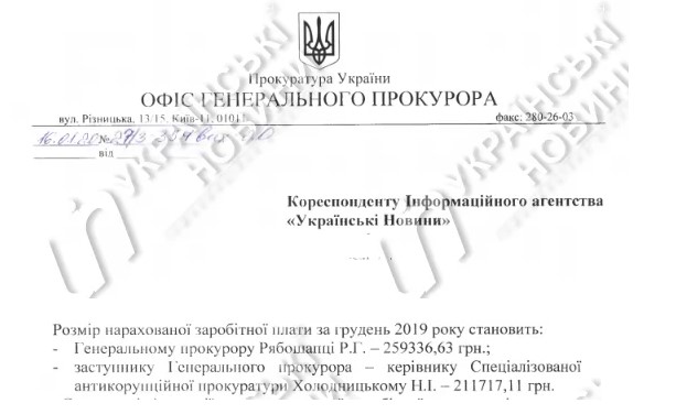 "Размер начисленной заработной платы за декабрь 2019 года составляет: Генеральному прокурору Рябошапке Р.Г – 259 336,63 грн", - говорится в сообщении.