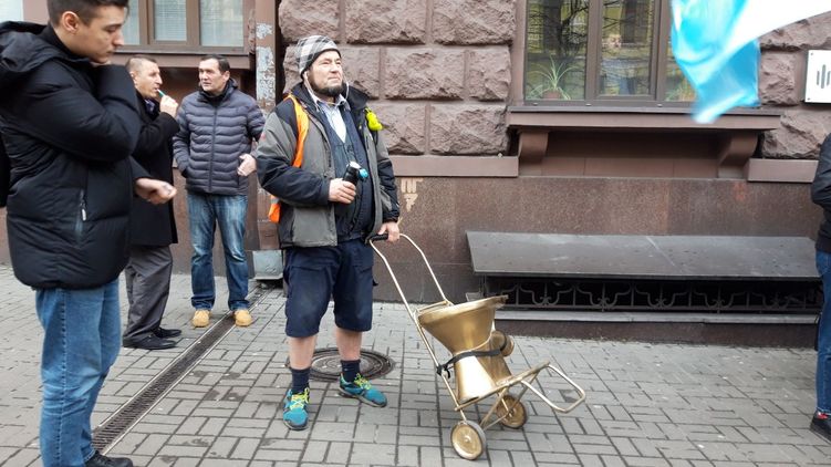 К офису ГБР мужчина привез на тележке выкрашенный в золотой цвет унитаз, который по его замыслу олицетворяет коррупцию Порошенко. Поддерживающие бывшего президента активисты устроили потасовку и разбили коррупционный унитаз.