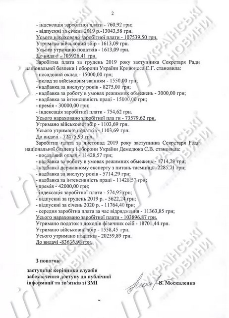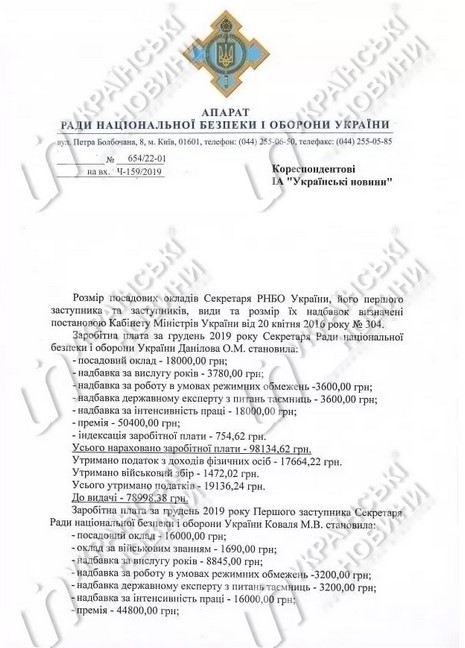 Также журналисты опубликовали ответ аппарата СНБО, в котором говорится, что из зарплаты Данилова на налоги ушло почти 20 тыс. гривен.