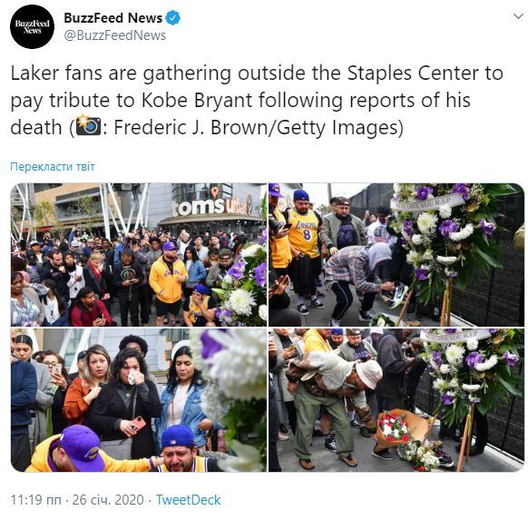 "Великий баскетболист Коби Брайант и три других человека погибли в результате крушения вертолета в Калифорнии. Коби Брайант, несмотря на то, что был одним из действительно великих баскетболистов всех времен, только начинал в жизни. Он очень любил свою семью и имел такую сильную страсть к будущему. Потеря для его прекрасной дочери Джанны делает этот момент еще более разрушительным...