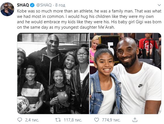 Экс-коллега Брайанта Шакил О'Нил также выразил свои соболезнования: "Коби был гораздо больше, чем спортсмен, он был семьянином. Это то, в чем нас было больше всего общего. Я обнимаю его детей, как будто они мои, и он обнимает моих детей, как они были его. Его малышка Джиджи родилась в тот же день, что и моя младшая дочь Меара".