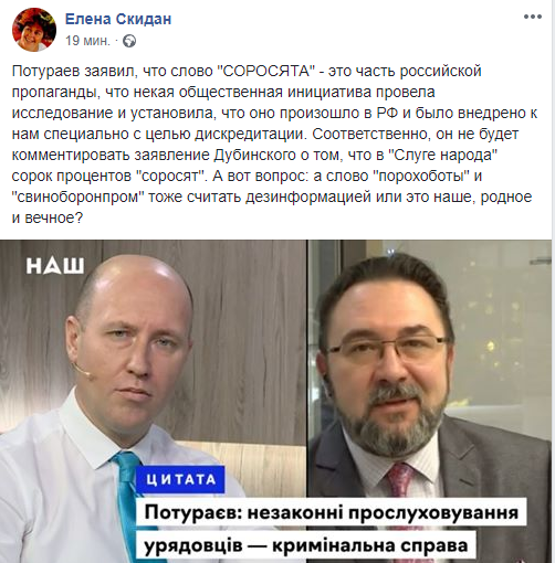 "Потураев заявил, что слово "СОРОСЯТА" - это часть российской пропаганды, что некая общественная инициатива провела исследование и установила, что оно произошло в РФ и было внедрено к нам специально с целью дискредитации. Соответственно, он не будет комментировать заявление Дубинского о том, что в "Слуге народа" сорок процентов "соросят". А вот вопрос: а слово "порохоботы" и "свиноборонпром" тоже считать дезинформацией или это наше, родное и вечное?" - пишет журналист Елена Скидан.