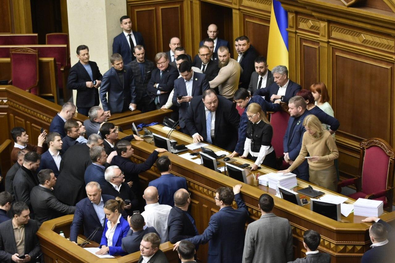 13:01  Драка у входа в президиум. Толкаются представители "Батькивщины" и "Слуг народа". Стефанчук призывает занять места, никто не слушает. "Доказывайте свою правоту в дискуссии, а не в кулачных махачах-прыжках!".