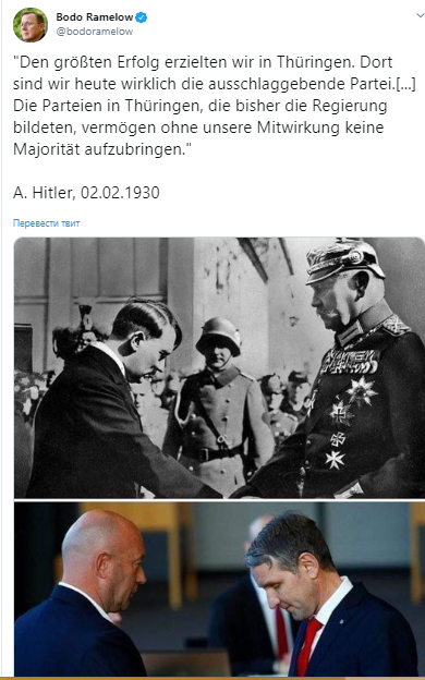 Бывший глава земельного правительства Тюрингии Бодо Рамелов после победы Киммериха разместил в твиттере цитату Адольфа Гитлера, которая удивительным образом подходила к этой ситуации.