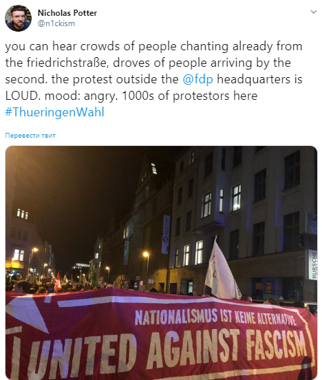 Этому предшествовали демонстрации в нескольких городах Тюрингии, а также в Берлине, Гамбурге и Дюссельдорфе. У офисов "Свободных демократов" демонстранты выразили недовольство сотрудничеством с AдГ.