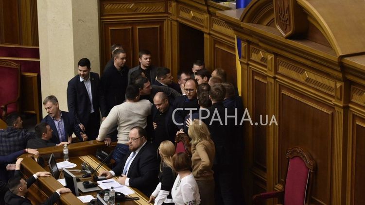 Депутаты от "Оппозиционной платформы - За жизнь" заблокировали трибуну парламента. После этого началась потасовка. В основном толкались представители "Батькивщины" и "Слуги народа". Первый заместитель председателя Верховной Рады Руслан Стефанчук попытался успокоить нардепов, но никто его не послушал.