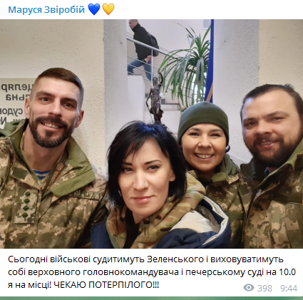 09:55 Зверобой заявила, что ждет потерпевшего Зеленского в суде и что сегодня "военные будут судить Зеленского".
