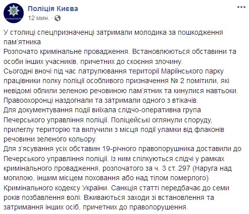 Уточняется, что по данному факту открыто уголовное производство по ч. 3 ст. 297, которая предусматривает до семи лет лишения свободы. Сейчас проводится поиск второго вандала.