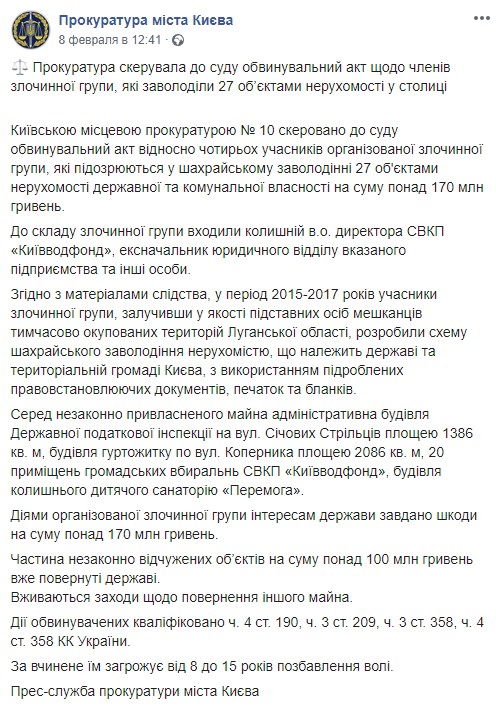 Киевская местная прокуратура направила в суд обвинительный акт в отношении преступной группы, которая завладела 27 объектами недвижимости в столице.