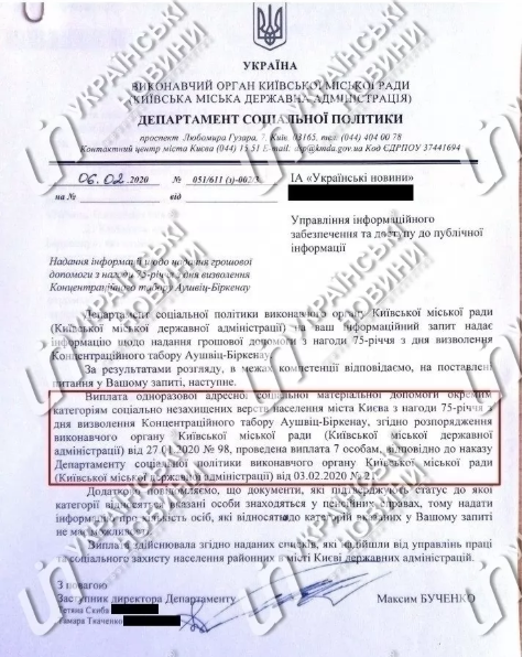 Ранее в КГГА разрекламировали выплату материальной помощи бывшим узникам Аушвица в рамках программы "Забота. Навстречу киевлянам". Виталий Кличко издал указ о выплате киевлянам-узникам Аушвица 27 января 2020 года - в день памяти жертв Холокоста.