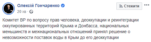 "Комитет ВР по вопросу прав человека, деоккупации и реинтеграции оккупированных территорий Крыма и Донбасса, национальных меньшинств и межнациональных отношений принял решение о невозможности поставок воды в Крым до его деоккупации", - написал он.