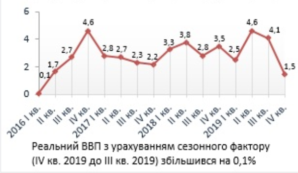 Рост валового внутреннего продукта (ВВП) Украины в октябре-декабре 2019 года составил 1,5% к аналогичному периоду 2018 года, тогда как в предыдущих кварталах темп роста был выше: в третьем - 4,1%, во втором - 4,6% и в первом - 2,5%. Такие данные обнародованы на сайте Госстата.