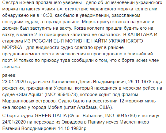 Родные моряка жалуются, что инцидент произошел 8 февраля, однако представитель крюинговой компании сообщил родным эту весть 13 февраля. "После списания капитану и старпому, на их место пришли граждане России из Ростова-на-Дону, с которыми у пропавшего Горяева А.А. были недоразумения, об этом Горяев А.А. сообщил родным в телефонном разговоре 23.01.2020 г.", - говорится в сообщении.