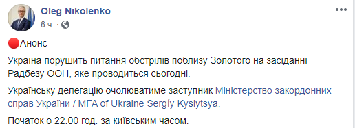 "Украина поднимет вопрос обстрелов вблизи Золотого на заседании Совбеза ООН, которое проводится сегодня", - написал Николенко.