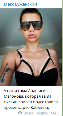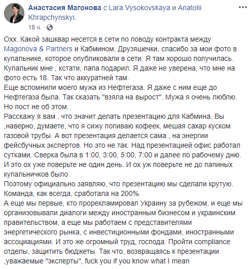 "Охх. Какой зашквар несется в сети по поводу контракта между Magonova & Partners и Кабмином. Друзяшечки, спасибо за мои фото в купальнике, которое опубликовали в сети. Я там хорошо получилась. Купальник мне, кстати, папа подарил. Я даже не уверена, что мне на фото есть 18. Так что аккуратней там.