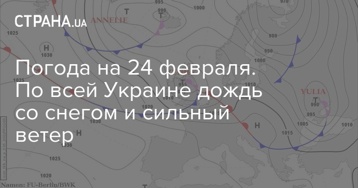Синоптики предупредили украинцев о существенном ухудшении погоды в понедельник, 24 февраля. В Украине сегодня ожидается сильный штормовой ветер, который придет благодаря встрече на нашей территории двух циклонов - Юлия и Ксантиппа.