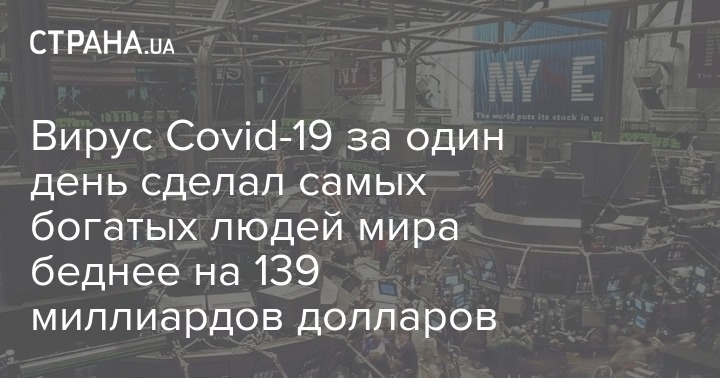 Так, состояния 500 богатейших людей Земли сократились на 139 миллиардов долларов всего за один день из-за падения индексов на фондовых биржах. Котировки рухнули в свете опасений, что распространение коронавируса серьезно навредит мировой экономике. Это крупнейшие дневные потери за четыре последних года, как сообщает Bloomberg.