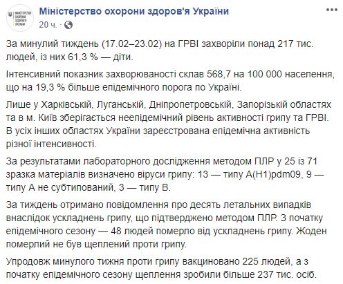 В настоящий момент неэпидемический уровень активности гриппа и ОРВИ сохраняется в Харьковской, Луганской, Днепропетровской, Запорожской областях и Киеве. Во всех других областях Украины зарегистрирована эпидемическая активность различной интенсивности.