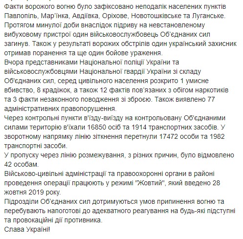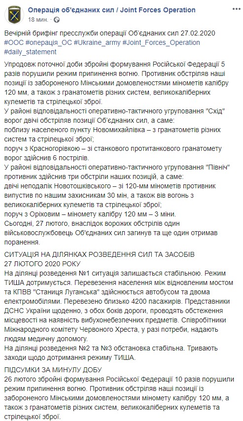 "Противник обстрелял наши позиции из запрещенных минскими договоренностями минометов калибра 120 мм, а также из гранатометов различных систем, крупнокалиберных пулеметов и стрелкового оружия… Сегодня, 27 февраля, в результате вражеских обстрелов один военнослужащий Объединенных сил погиб и еще один получил ранения", - говорится в вечерней сводке.